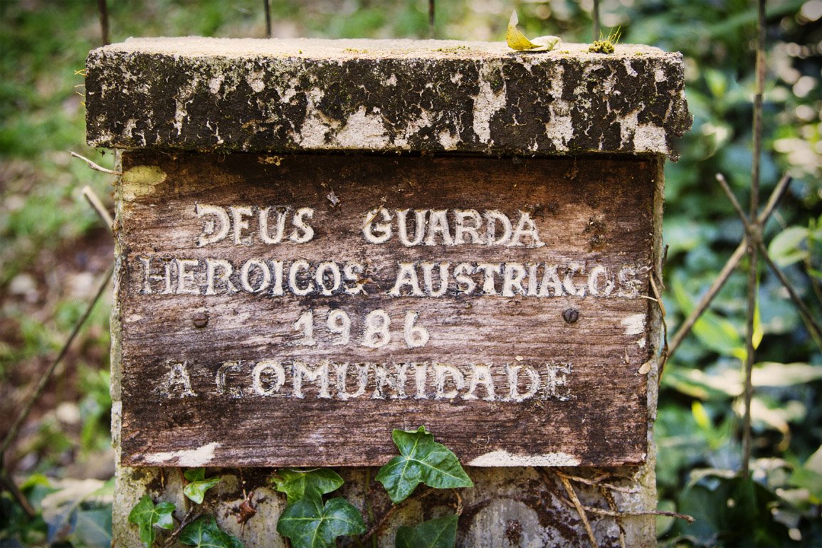 Título: Homenagem aos imigrantes austríacos Descrição: "Deus guarda heróicos austríacos, 1986, a comunidades". Cemitério dos Imigrantes em Babenberg Local: Treze Tílias, SC Data do Registro: 14/10/2012