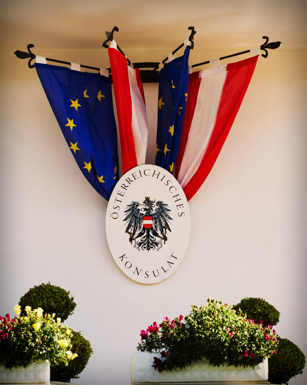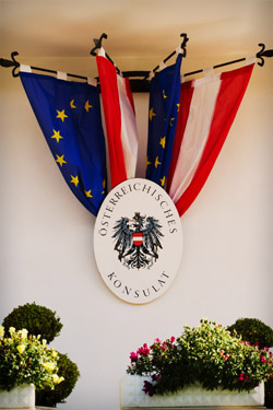 Título: Bandeiras da Áustria e da União Européia Descrição: Consulado da Áustria Local: Treze Tílias, SC Data do Registro: 13/10/2012