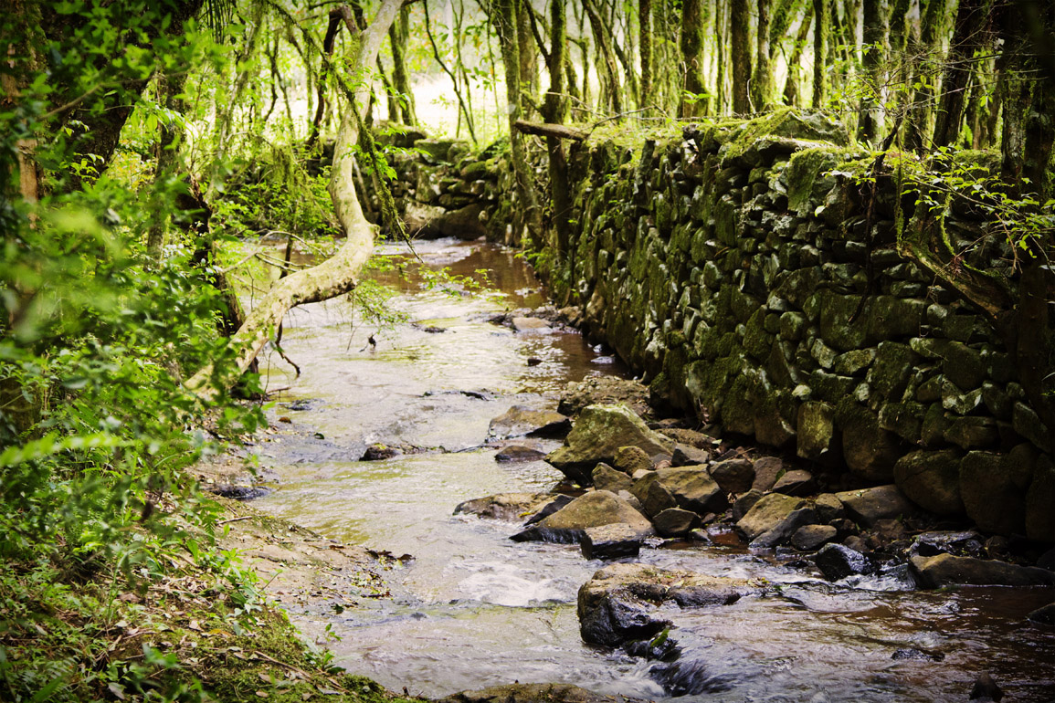 Título: Sanga com muro de pedras Descrição: Córrego da propriedade da família Felder. O muro de pedra (taipa) foi construído pelo imigrante austríaco Fidel Felder na década de 1940 Local: Treze Tílias, SC Data do Registro: 11/10/2013