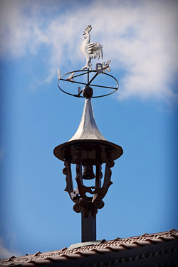 Título: Campanário Descrição: Os campanários têm como elementos: a figura de um galo e um sino. O galo significa a disposição das pessoas para o trabalho, e o sino soa para marcar o tempo e para anunciar eventos Local: Treze Tílias, SC Data do Registro: 14/10/2012