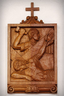 Título: 11ª Estação da Via Sacra: Jesus é Pregado na Cruz Descrição: Interior da Igreja Nossa Senhora do Perpétuo Socorro. Escultura em madeira, obra do escultor Conrado Moser Local: Treze Tílias, SC Data do Registro: 12/03/2013