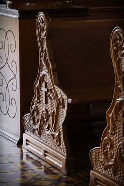 Título: Bancos da Igreja Descrição: Escuturas em madeira, obra de Bruno Thaler. Interior da Igreja Nossa Senhora do Perpétuo Socorro Local: Treze Tílias, SC Data do Registro: 12/03/2013